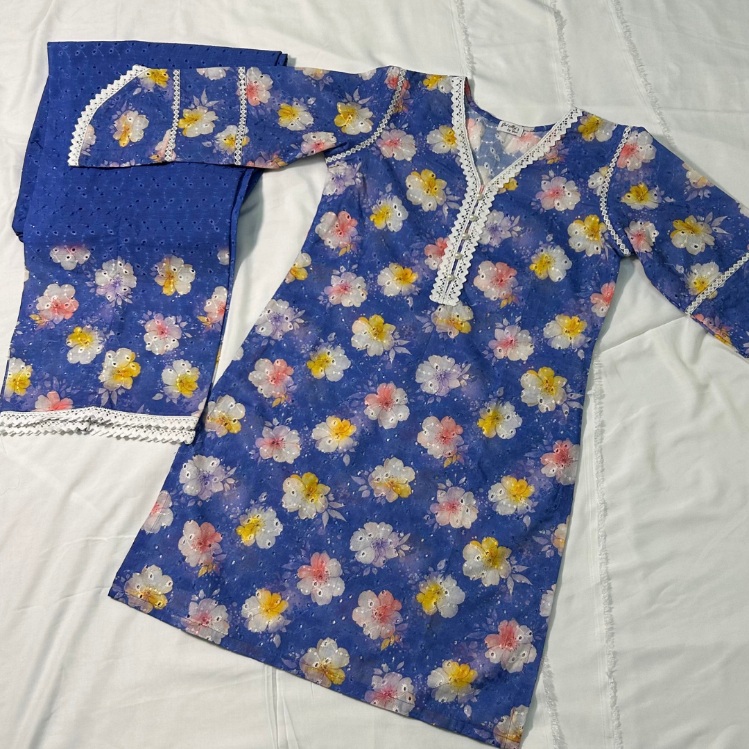 Elevate your everyday elegance with this stunning blue floral suit,The kurti features white lace detailing along the neckline and sleeves. The front is beautifully finished with pearl. Paired with a same-fabric loose trouser, designed with matching white lace edging.