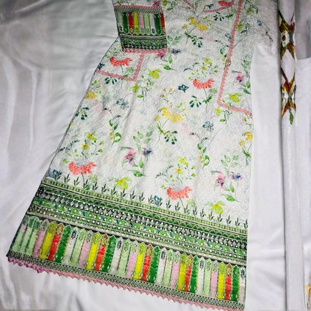 Our cotton print Chikankari long Kurti, crafted for comfort and everyday grace. The soft cotton fabric features delicate printed patterns enhanced with subtle Chikankari-inspired detailing, giving it a timeless, handcrafted charm. Finished with a beautiful pink lace on the sleeves and hem.