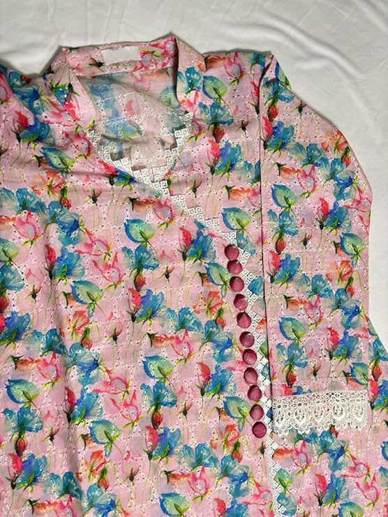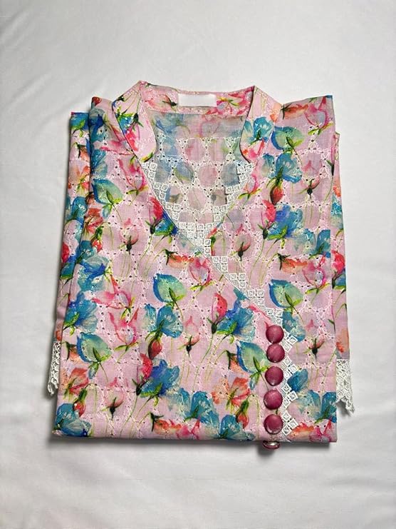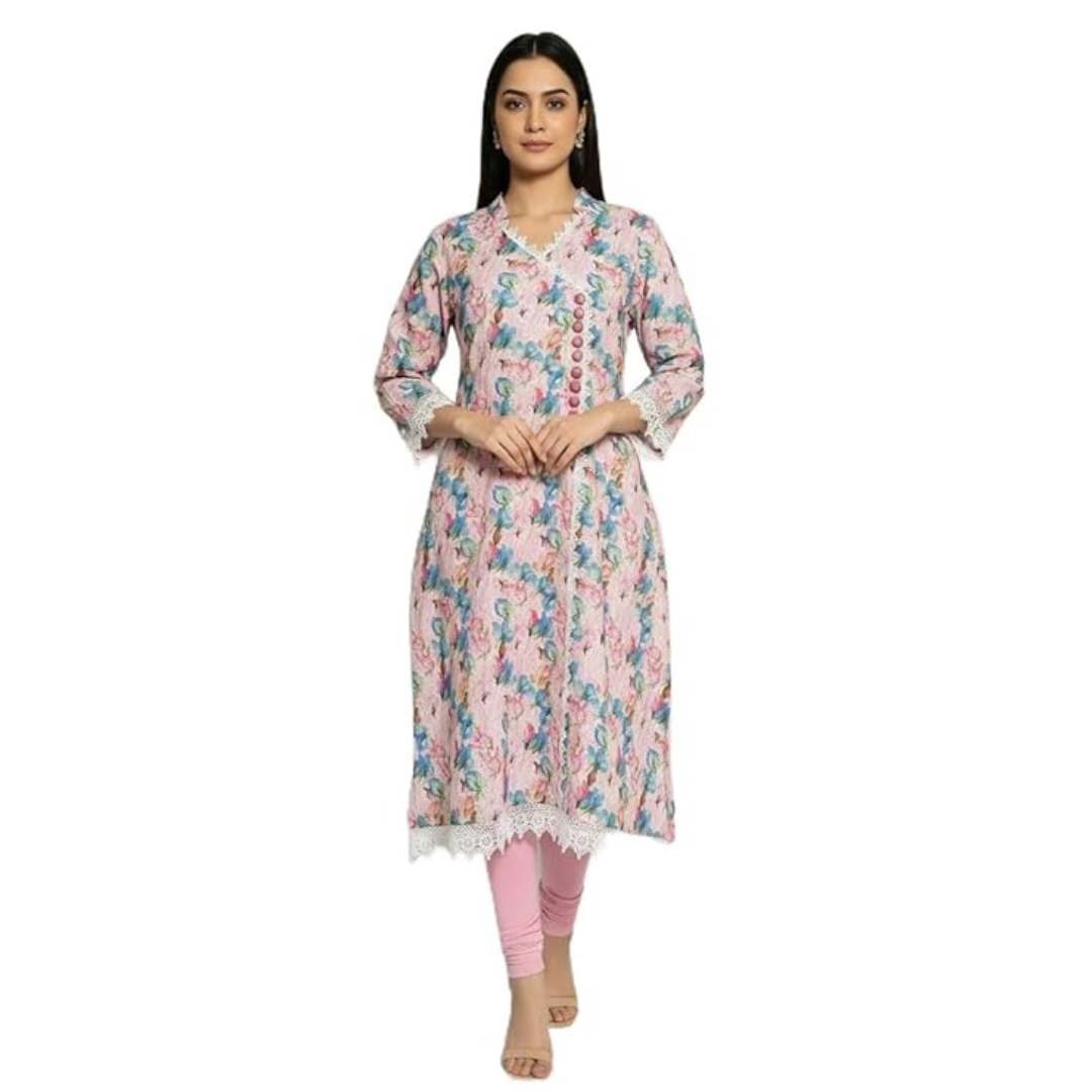 A soft pastel floral printed kurti featuring a V-neck with delicate lace detailing, decorative front buttons, and 3/4th sleeves finished with lace. The hemline also carries intricate lace for an elegant, feminine touch. Comfortable, lightweight, and perfect for everyday or semi-formal wear.