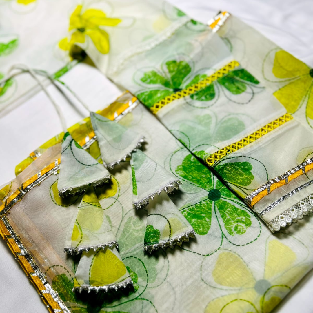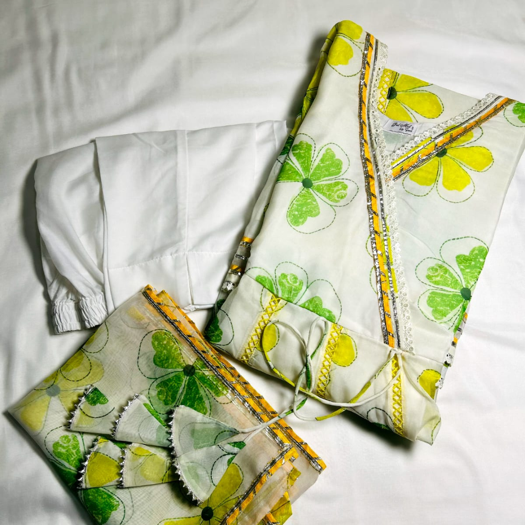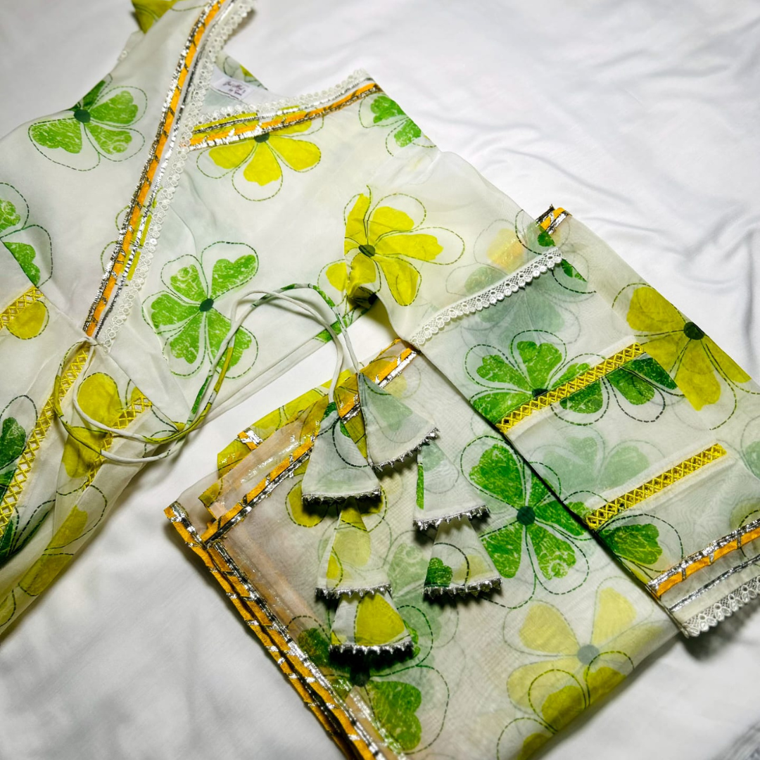 White Soft Organza Anarkali, adorned with a refreshing green and yellow floral print that brings a soft, graceful charm to the look. Crafted from premium soft organza, the Anarkali flows beautifully with every movement.